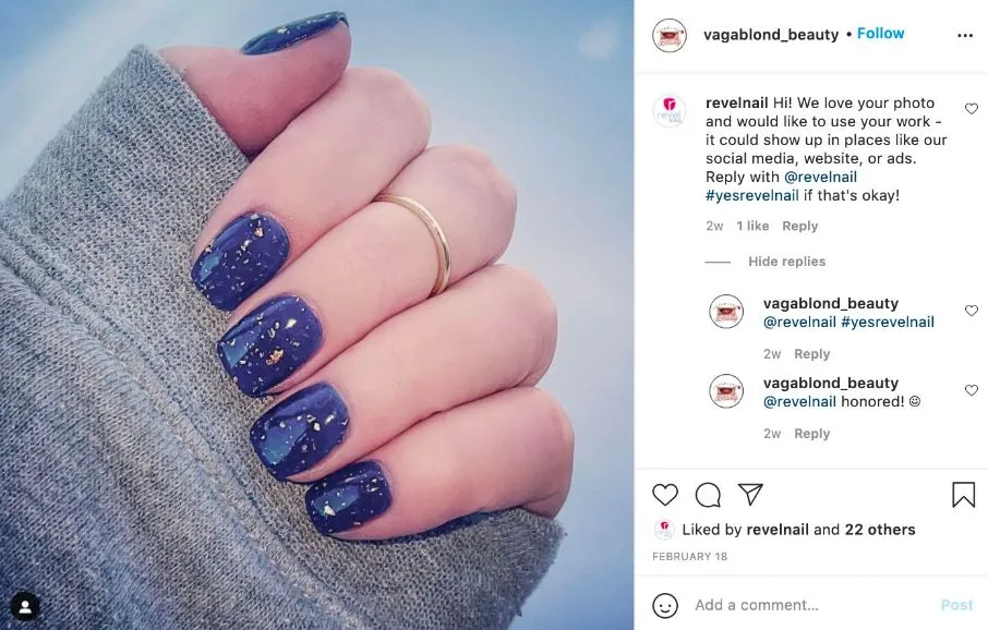 Evelyn Taylor, Marketing Associate at Pixlee TurnTo, shared an example from Revel Nail, a brand that responds to UGC to ask customers if they can use the image.