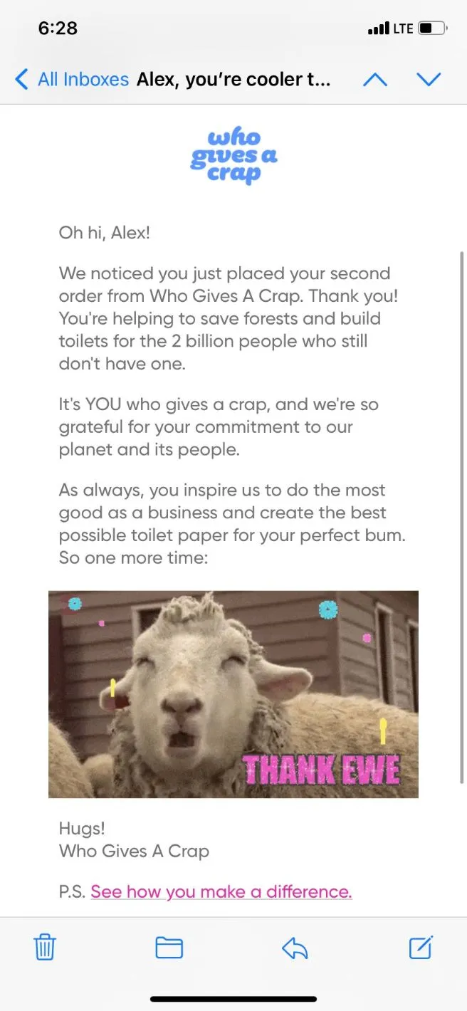 Alex McPeak, Content Strategist at Klaviyo, shared an experience she had with Who Gives A Crap: “I really loved this email I received after I placed my second order with the brand. It’s a really great example of how brands can use personalization to add a human touch and build relationships with customers!”