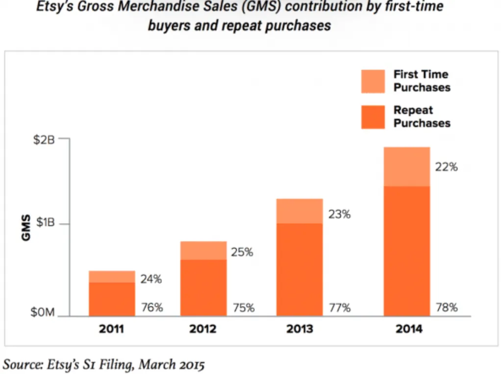 In most cases, retaining customers on a marketplace is much, much more effective than acquiring new ones. Repeat purchases are what sustain and scale businesses. Just look at Etsy’s stats from 2011 to 2014.
