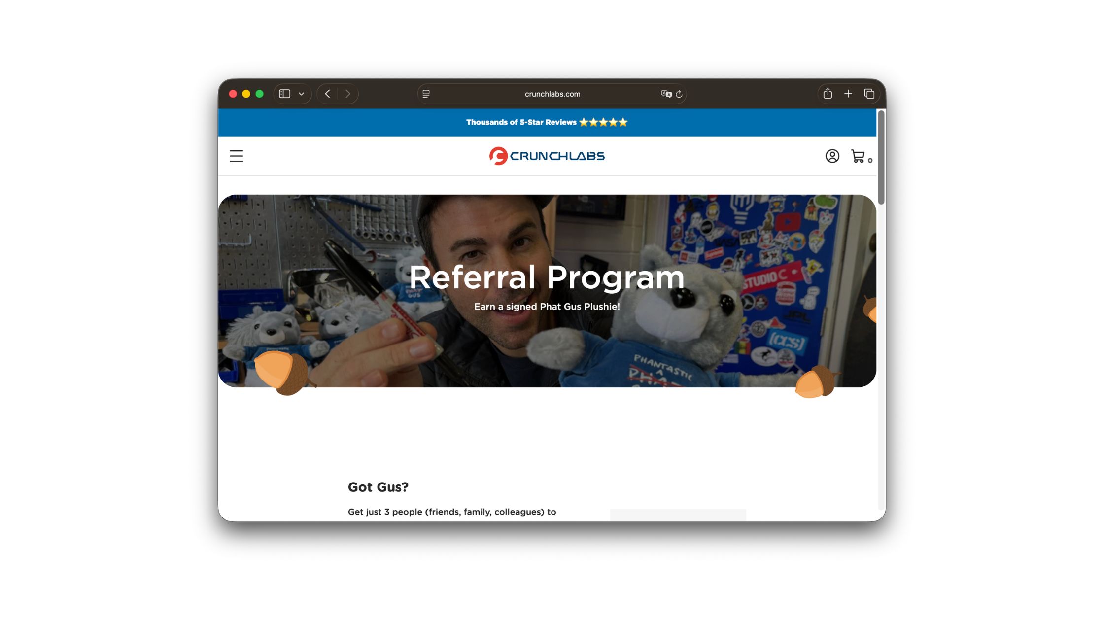 Mark Rober's engineering classroom in a box. Each month kids build a new mechanism — things that fly, flip, launch, or solve problems — guided by the former NASA engineer who made millions of people fall in love with tinkering on YouTube. The subscription is the rare kids' product that parents recommend to each other because their own kids actually finish it. Referrers earn $10 in store credit for every new subscriber they bring in, plus a signed Phat Gus plushie after three successful referrals — a branded collectible tied to the program itself. Rewards with personality tend to outperform flat cash in brands built on personality.