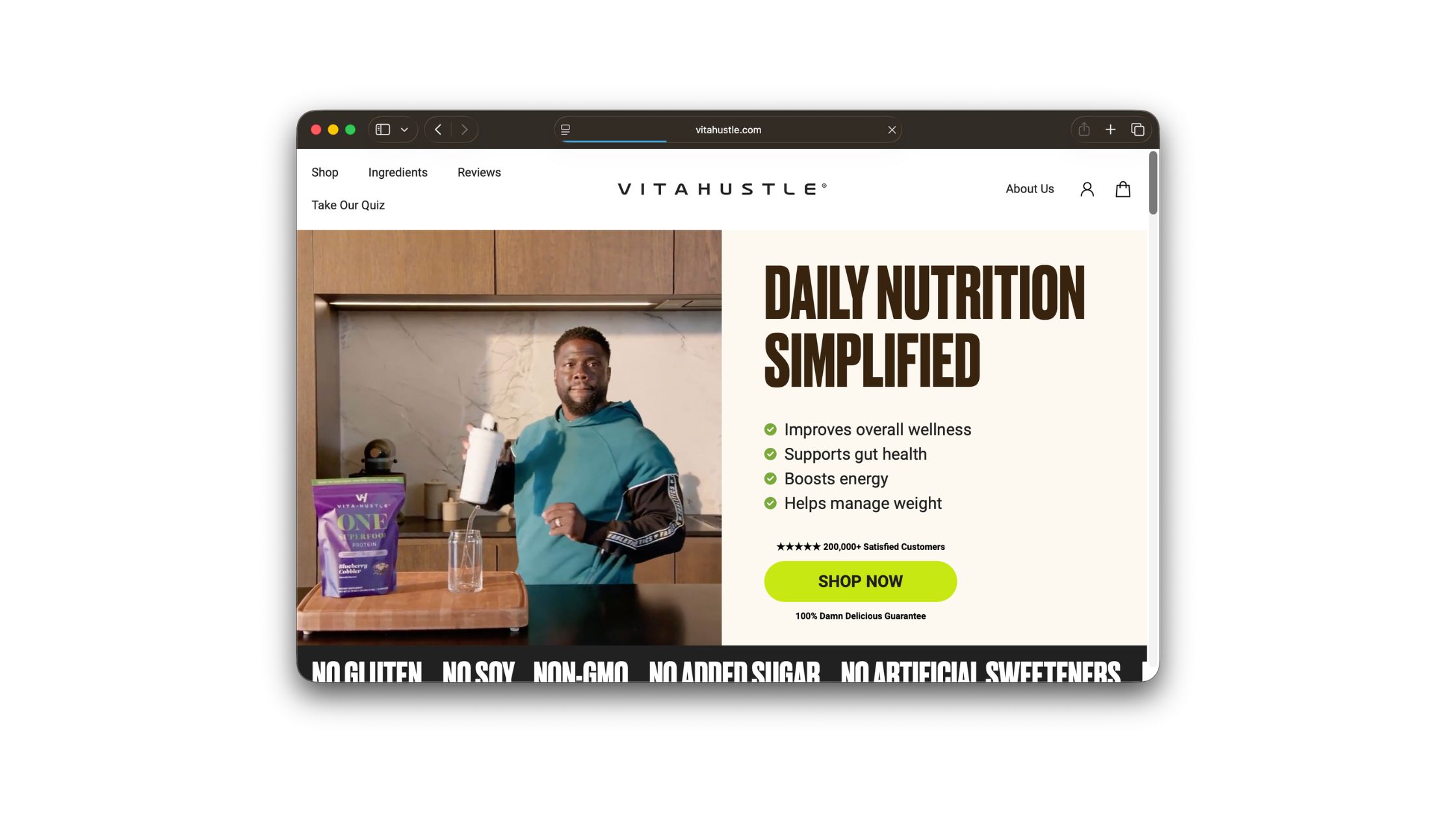 Kevin Hart built VitaHustle around a specific frustration — that eating decently on a busy schedule usually means juggling five or six supplement bottles. The all-in-one superfood protein shake consolidates that stack into a single scoop, which tells you exactly who it's for: people whose schedules won't accommodate a wellness routine. The referral reflects the same logic — friends get $20 off when they order two or more bags, and the referrer earns $20 back once the order goes through.