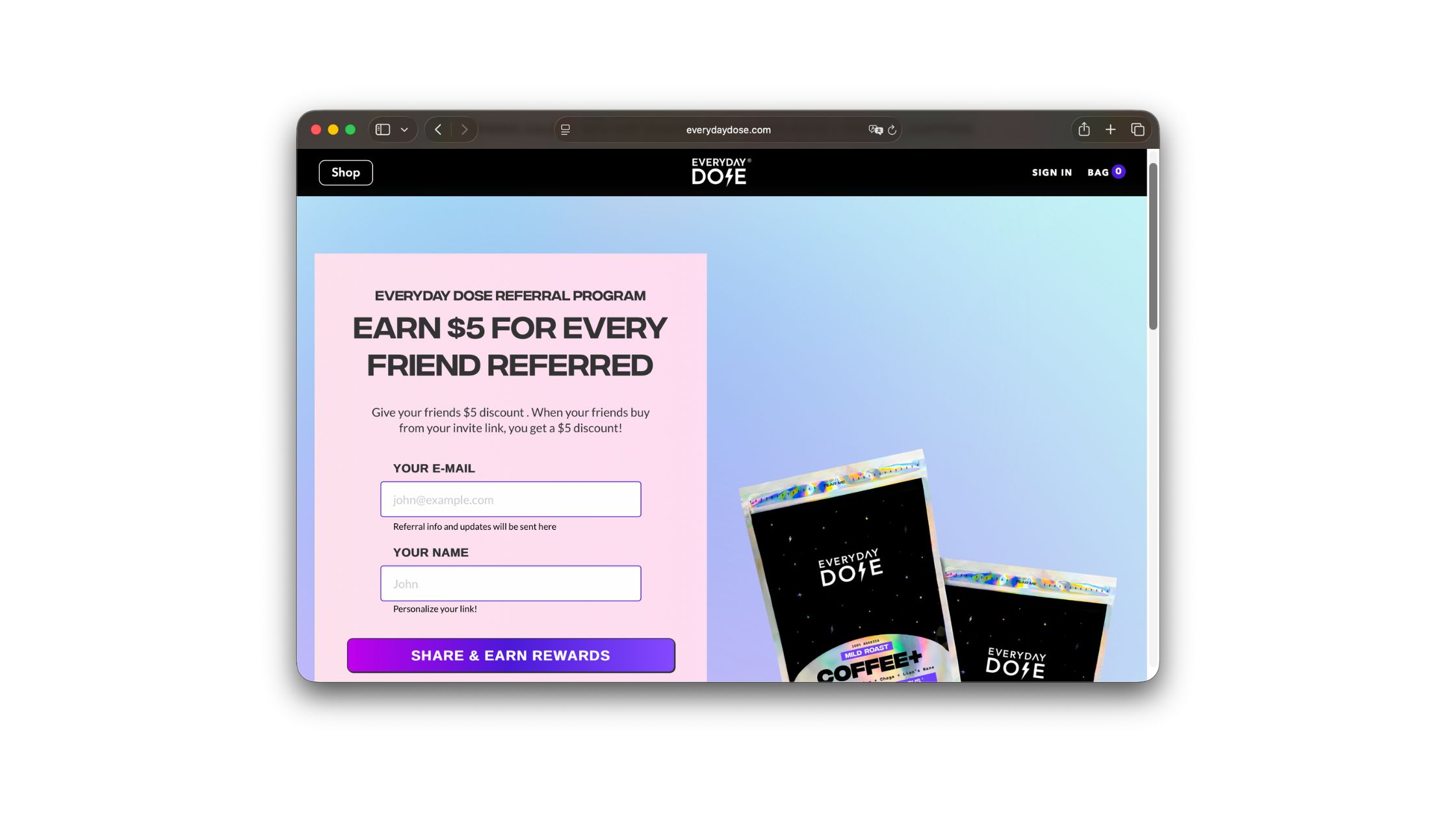 Coffee for people renegotiating their relationship with caffeine. A functional mushroom blend — lion's mane, chaga, collagen, L-theanine — with less than half the caffeine of a regular cup, which turns out to be the ratio a lot of people actually wanted once somebody offered it. The brand sits with the morning-ritual crowd that wants the cup without the crash. Referrals give the friend's first order $5 off and the referrer $5 in credit, with no cap on how many friends they can bring in.