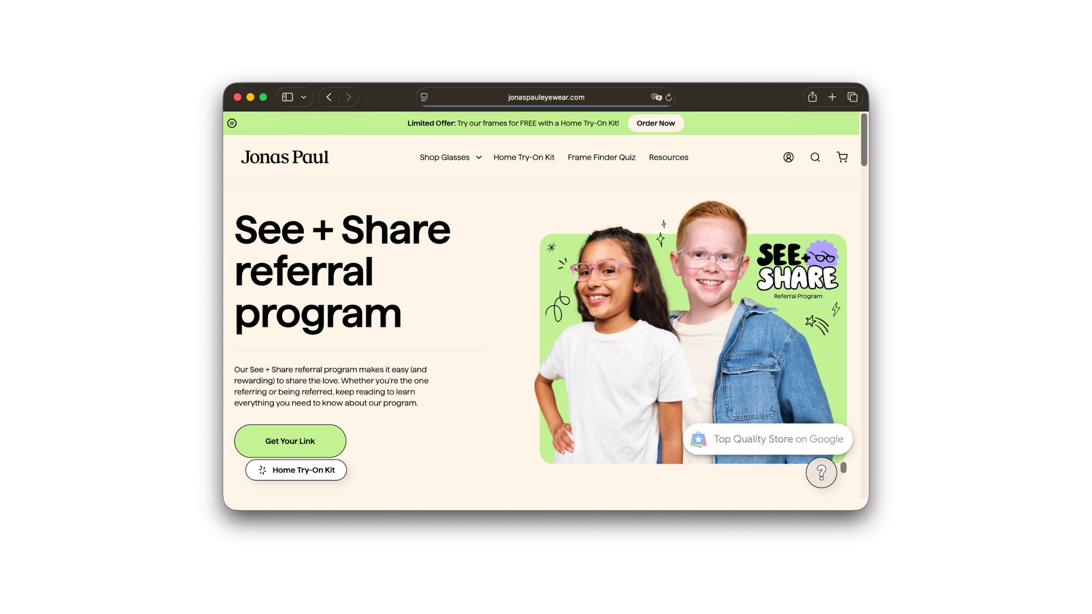 Kids' eyewear has been a neglected category for decades — boring frames, questionable durability, or both. Jonas Paul rebuilt it around frames kids actually want to wear, and extended that same design care into adult eyewear. The parents buying for their kids frequently become customers themselves, which is how a quiet niche turned into a real brand. Friends get 50% off their first $49+ purchase; the referrer earns $50 in store credit per referral, uncapped. Generous on both sides, with smart email reminders which fits a category where parents recommend parents long before any program gets involved.