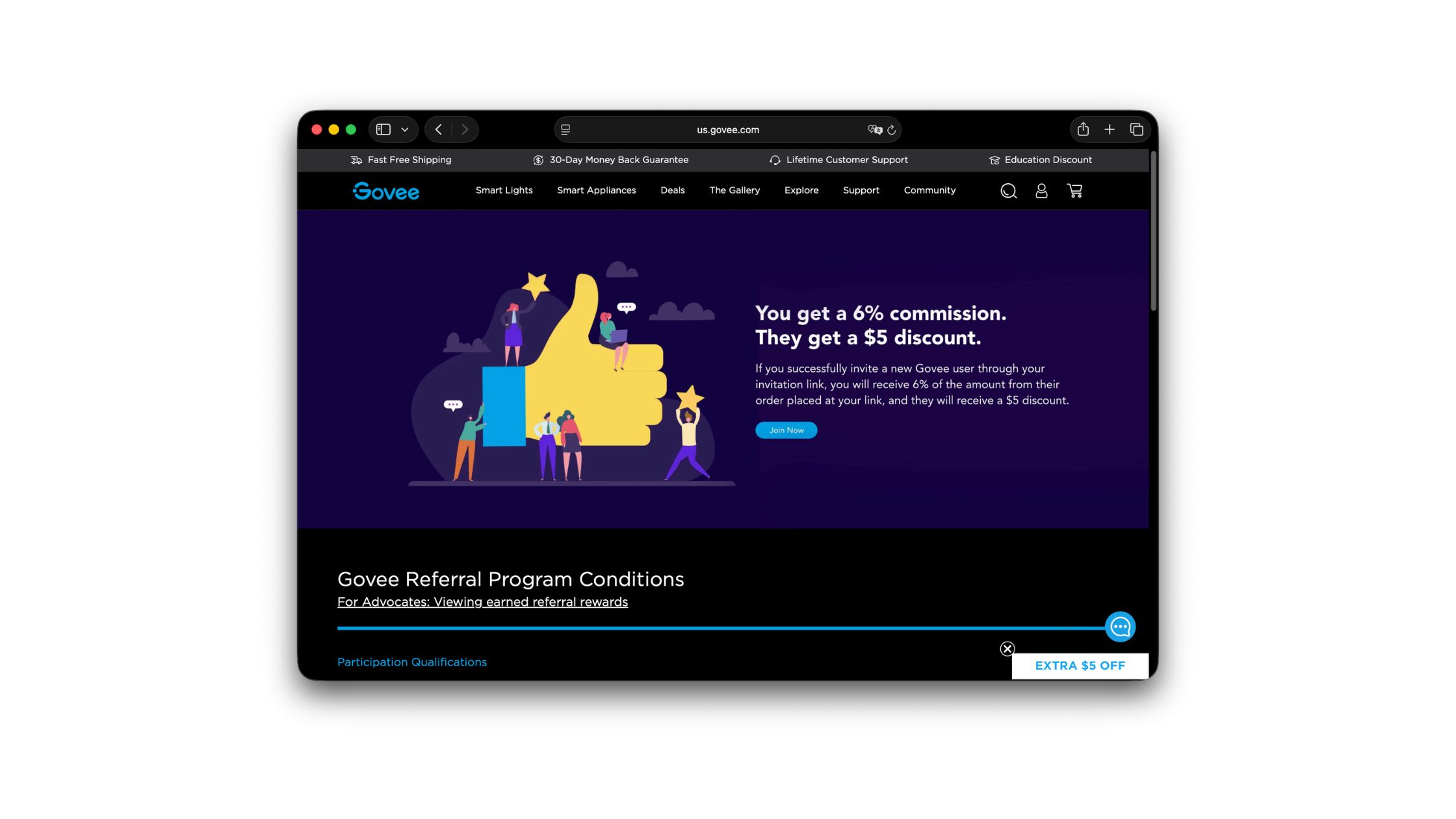 Govee is smart lighting for maximalists — RGBIC LED strips, outdoor ambient setups, music-reactive lamps, plus the smart plugs and sensors that round out a connected home. Its customers post their Govee-lit spaces online constantly — living rooms, gaming setups, holiday displays — which means a referral program sits naturally on top of content that was going to get made regardless. Friends get $5 off a first order of $30 or more, and the referrer earns a 6% commission on that purchase. Percentage-based commissions are unusual in consumer referrals — they treat active sharers more like affiliates than occasional recommenders.